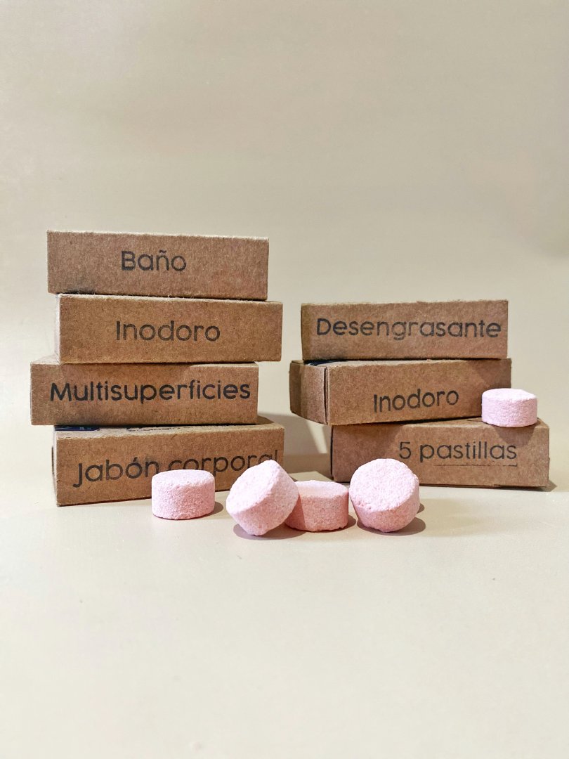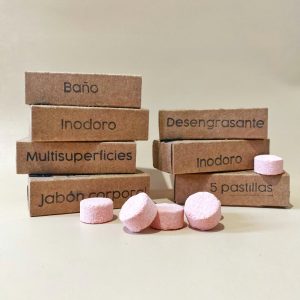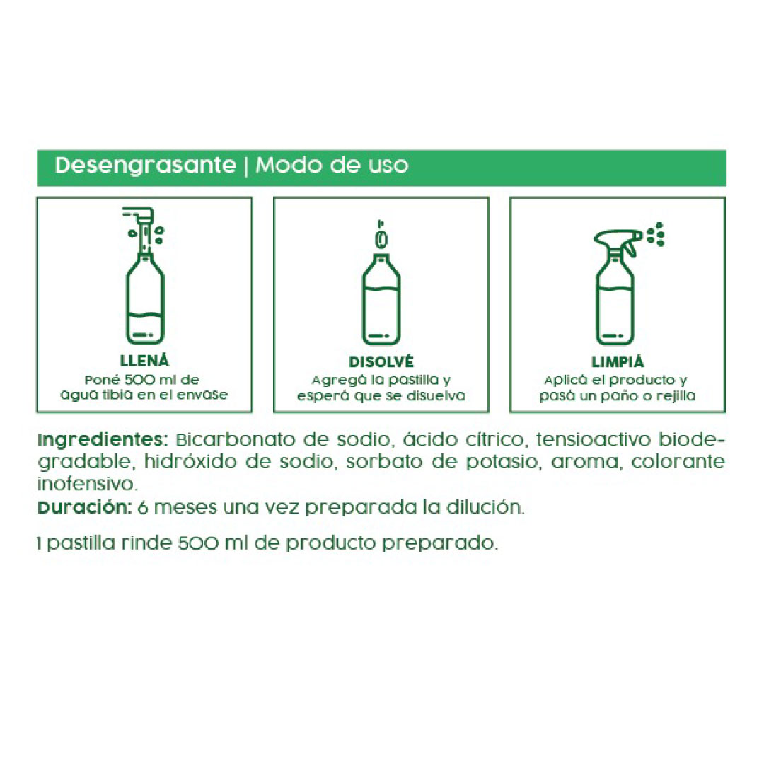 Modo de uso: Poner 500ml de agua en un envase, agregar la pastilla y esperar que se disuelva. Aplicar el producto sobre la superficie y pasar un paño o rejilla.